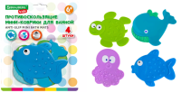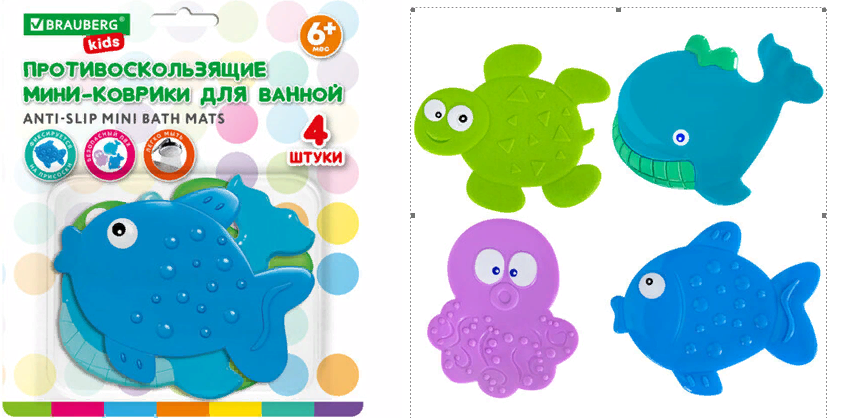 Мини-коврики для ванной BRAUBERG KIDS – это яркие фигурки для купания на присосках, которые крепятся на любую гладкую поверхность, при этом не оставляют следов. Они сделаны из безопасных материалов, сертифицированы и имеют множество способов применения. Мини-коврики представляют собой набор из 4-х разноцветных изделий на присосках в виде кита, рыбки, осьминога и черепахи, которые превратят купание в веселое развлечение. Упакованы в красочный блистер. Рельефная поверхность коврика обеспечит малышу мягкий массаж стоп, а также поможет удержать равновесие на гладком покрытии ванной, предотвращая скольжение во время водных процедур. Коврики легко мыть и они быстро сохнут. Привлекательные и приятные на ощупь игрушки помогут развить сенсорное восприятие ребенка.Ими можно также украсить интерьер, налепив коврики на дно и стенки ванны или кафель, чтобы не только обеспечить удобство при купании, но и добавить ярких цветов в оформление ванной комнаты.