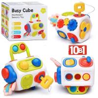 • Игрушка содержит вращающиеся детали, нажимающиеся кнопки, поворачивающиеся рычаги и пищалку.