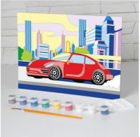 В наборе: картонная основа с пронумерованными контурами, краски акриловые в баночках (9 цветов), кисть, инструкция.