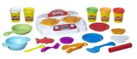 Электронная плита; 4 формы-штампика; 2 сковородки; 2 тарелки; Щипцы; Лопатка; Нож; Вилка; 5 баночек пластилина Play-Doh