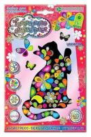 Картины-антистресс - это лучший способ отдохнуть и зарядиться энергией творчества! Ребёнок старше 5 лет легко наклеит на матированный полупрозрачный пластик изящные чёрные силуэты кота Царапки и порхающих вокруг бабочек, заполнит их узорными радужными стикерами, а потом украсит картину блестящими голографическими элементами разнообразных форм.