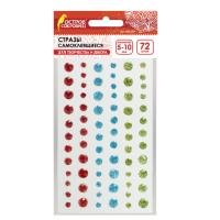 Самоклеящиеся круглые стразы диаметром 5 мм, 8 мм и 10 мм предназначены для украшения различных изделий. В упаковке содержится 72 страза 3 разных цветов - красный, голубой, зелёный. Благодаря наличию граней на поверхности, блестящие стразы сверкают и переливаются ещё сильнее.