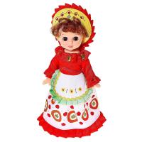 Кукла «Эля Дымковская барыня» одета в русский национальный костюм: красивый сарафан с передником и кокошник. У неё выразительные закрывающиеся глаза и прошивные длинные волосы, на которых юный парикмахер будет тренироваться делать прически.