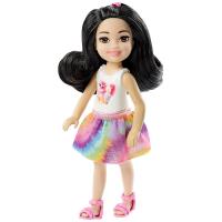 Кукла Челси большая модница и обожает милые наряды! Она одета в пышную юбочку яркого радужного цвета и светлый топ, на котором изображен забавный котенок с аппетитным мороженным. Удобные розовые сандалии дополняют образ.