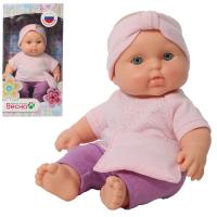 Пупс выглядит совсем как настоящий – красивые глазки, пухленькие щечки. Одет карапуз в изящный розовый детский костюмчик, на голове милая повязка.