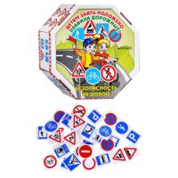 В наборе 50 фишек с изображением знаков дорожного движения - по две штуки с одинаковым рисунком. Нужно разложить фишки "лицом" вниз, а затем переворачивать по 2. Если они совпадают - игрок забирает их и получает ещё ход. Если нет - ход переходит к другому игроку. Задача - набрать как можно больше фишек.