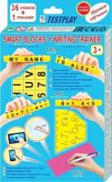 В состав входит два учебных пособия: - Умные кубики, для обучения английскому алфавиту и чтению, а также математике, - Тренажер для письма, для тренировки в написании букв английского алфавита. Пособие Умные кубики представляет собой набор из 36 кубиков, на гранях которых написаны буквы английского алфавита, знаки препинания, цифры и знаки математических действий. Благодаря специальной конструкции (выступ с одной стороны и отверстие с другой), кубики могут скрепляться между собой. Таким образом можно составлять слова, предложения, примеры. Так как кубики можно скреплять только определенным способом, ребенок не сможет расположить их неправильно (зеркально или к верх ногами), что важно на этапе обучения, чтобы не сформировались неправильные представления о буквах. Количество букв, цифр и знаков на гранях кубиков выбрано с учетом частоты их использования и позволяет составлять достаточно сложные слова, предложения и примеры.