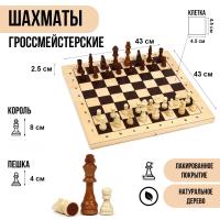 Шахматная деревянная лакированная доска из качественных пиломатериалов: каркас выполнен из сосны, поле - берёзовая фанера. Размер доски в разложенном виде 43 х 43 см. Доска имеет аккуратную и надежную фурнитуру и вместительный отсек для хранения.
