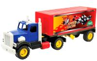 Яркая модель представляет собой копию грузовика с вместительным кузовом.