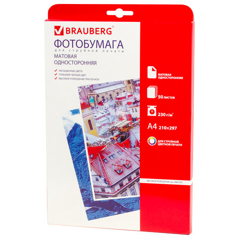 Матовая односторонняя фотобумага BRAUBERG подходит для всех типов струйных принтеров. Незаменима при распечатке бизнес-графики, презентаций, флаерсов.