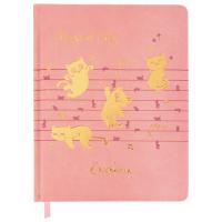 Внутренний блок изготовлен из белой офсетной бумаги повышенной плотности 70 г/м2. Содержит 48 листов для ведения записей и справочной информацией – длительности нот, интервалы, знаки в тональностях, ключи. Обложка выполнена в розовом цвете из экокожи – презентабельного и износоустойчивого материала. Элементы дизайна выполнены с помощью термотиснения и фольги. Для удобства использования дневник снабжен закладкой-ляссе.