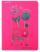 Дневник "deVENTE. Sweets" универсальный блок, офсет 1 краска, белая бумага 80 г/м2, твердая обложка из искусственной кожи, шелкография, аппликация в виде кармана, тиснение фольгой, цветной форзац, 1 ляссе