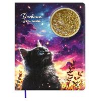 Дневник школьный арт. 68678 / 15 КОТ И ЛУНА (кожзам: А5+; твёрдый переплёт с поролоном, материал обложки: искусственная кожа "Наппа"; декор: аппликация в виде прозрачного пластикового окна с маслом, пайетками и глиттером внутри, печать полноцветная; способ крепления блока: ниткошвейный; вн. блок: 48 л., белый офсет 80 г/м?, печать в одну краску, справочный материал: универсальная шпаргалка; закладка: одно ляссе; форзац: печать в одну краску; индивидуальная упаковка: ПЭТ-пакет)
