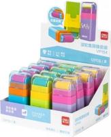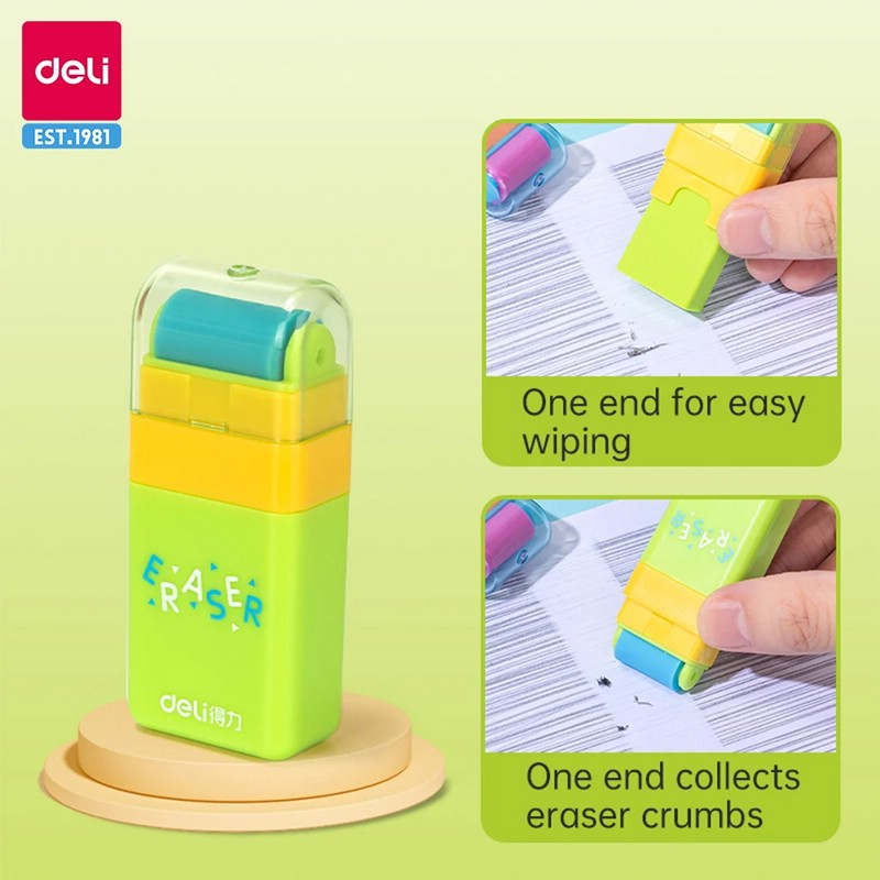 Ластик Deli, ПВХ, 60×26×16 мм, с липким роликом для удаления остатков ластика.