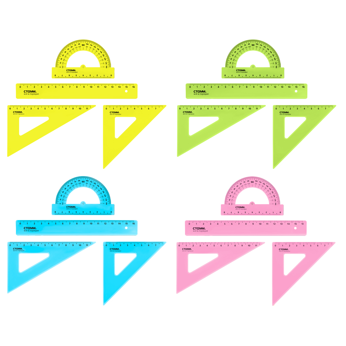 Набор чертёжный СТАММ S – отличный вариант для выполнения чертёжных и измерительных работ. Он включает в себя: линейку длиной 16 см, два треугольника 11/30°, 7/45° и транспортир 180°/8. Набор представлен в ярких неоновых цветах, цвет шкалы – чёрный. Все изделия в наборе имеют безопасные закруглённые углы и чёткую миллиметровую шкалу. Чертёжные принадлежности изготовлены из качественного полистирола. Чернила, используемые для нанесения шкалы на изделия, устойчивы к истиранию в процессе использования. Индивидуальная упаковка − пакет с европодвесом.