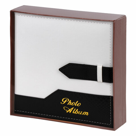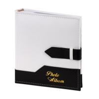 Состоит из 50 бумажных листов размером 15,5х21 см с карманами и вмещает 200 фотографий размером 10х15 см, по 2 штуки на странице. Обложка фотоальбома скомбинирована из двух материалов, под кожу рептилии и замшу контрастных белого и черного цветов и украшена регулируемой по длине застежкой. Фотоальбом с книжным переплетом отличается повышенной прочностью и долгим сроком службы. Размер - 20,7х21,8 см.