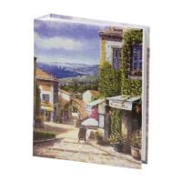 Состоит из 50 полипропиленовых листов размером 17,5х22 см с карманами и вмещает 200 фотографий размером 10х15 см по 2 штуки на странице. На обложке фотоальбома изображена улица старого города, а его листы склеены в единый блок. Размер - 18х23 см.