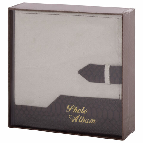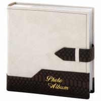 Состоит из 50 бумажных листов размером 15,5х21 см с карманами и вмещает 200 фотографий размером 10х15 см по 2 штуки на странице. Обложка фотоальбома скомбинирована из материалов под кожу рептилии и замшу контрастных коричневого и бежевого цветов, которая украшена регулируемой по длине застежкой. Фотоальбом с книжным переплетом отличается повышенной прочностью и долгим сроком службы. Размер - 20,7х21,8 см.