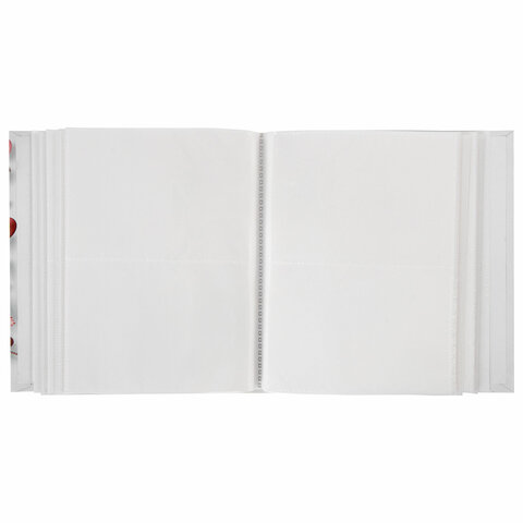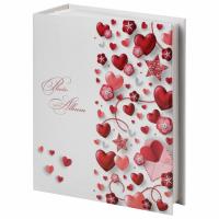 Состоит из 76 полипропиленовых листов размером 17,5х22 см с карманами и вмещает 304 фотографии размером 10х15 см по 2 штуки на странице. Обложка фотоальбома выполнена в белых и красных тонах с изображением сердец и звезд, а его листы склеены в единый блок. Размер - 18х23 см.