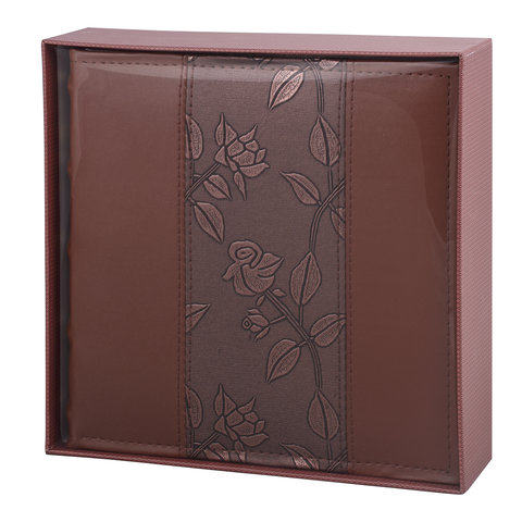 Состоит из 50 бумажных листов размером 15,5х21 см с карманами и вмещает 200 фотографий размером 10х15 см по 2 штуки на странице. Обложка фотоальбома скомбинирована из материала под кожу классик и вставки с рельефным рисунком. Фотоальбом с книжным переплетом отличается повышенной прочностью и долгим сроком службы. Размер - 20,7х21,8 см.