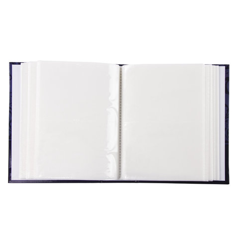 Состоит из 76 полипропиленовых листов размером 17,5х22 см с карманами и вмещает 304 фотографии размером 10х15 см по 2 штуки на странице. Обложка фотоальбома выполнена в темно-синих тонах с абстрактным дизайном, а его листы склеены в единый блок. Размер - 18х23 см.
