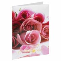Изготовлена из прочного ламинированного картона. Папка для поздравлений формата А4 выполнена в нежно-розовых тонах. На обложке - полноцветный рисунок с изображением роз и надпись "С Юбилеем!", нанесенная с помощью золотого тиснения. Снабжена лентой для удержания документов (ляссе).