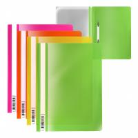 Папка-скоросшиватель формата А4 из высококачественного пластика с текстурой поверхности "апельсиновая корка", на которой не видно отпечатков пальцев и мелких царапин. Предназначена для быстрого сшивания, хранения и просмотра документов. Цвет папки – ассорти: желтый, зеленый, оранжевый, розовый. Механизм - механический скоросшиватель; прозрачный верхний лист; усиленный пластиковый корешок с прозрачной полосой для информационной карточки Папка вмещает до 130 бумажных листов. Размер - 312х230 мм, толщина верхнего листа - 0.12 мм, толщина нижнего листа - 0.14 мм.