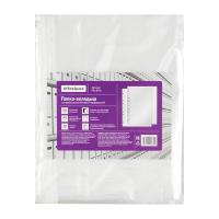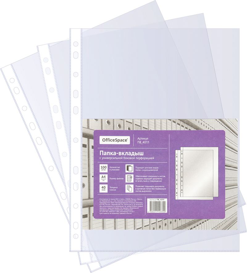 Глянцевые прозрачные файлы-вкладыши OfficeSpace формата А4 размера 305*235 мм имеют универсальную перфорацию для хранения документов формата А4 в любых папках с кольцевым механизмом и скоросшивателем. Вертикальная ориентация, толщина пленки 40 мкм, вместимость файла до 50 листов бумаги, прочные швы. В упаковке 100 штук. Глянцевая поверхность и яркий информационный вкладыш в каждой групповой упаковке.