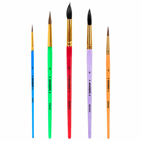 Кисти из волоса пони и белки отлично впитывают и отдают краску, хорошо держат форму, долговечны и надежны. Благодаря кистям № 2 и 3 ребенку будет комфортно прорисовывать мелкие детали. Кисти № 5, 6 и 8 позволят делать более крупные мазки и линии. Пластиковую рукоятку кисти удобно держать в руке.