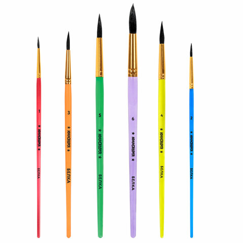 Кисти из волоса белки отлично впитывают и отдают краску, хорошо держат форму, долговечны и надежны. Благодаря кистям № 1, 2, 3, 4 и 5 ребенку будет комфортно прорисовывать мелкие детали. Кисть № 6 позволит делать более крупные мазки и линии. Пластиковую рукоятку кисти удобно держать в руке.