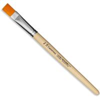 Кисть синтетика плоская № 16. Идентична натуральному колонку по параметрам жёсткости и эластичности. Упругость волоса даже выше, чем у колонка. Однако синтетика уступает колонковым по наполнению кистью водой и объему впитываемой краски. Синтетическими кисточками можно рисовать чёткие и ровные линии. Синтетический волос имеет капиллярный эффект, что позволяет использовать такие кисти даже в акварели. Кисть имеет длинную (20 см), деревянную ручку.