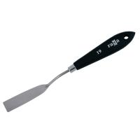 Паяный мастихин из нержавеющей стали с удобной плоской ручкой из натурального бука. Сварное соединение ручки и лезвия дает больший угол наклона мастихина к холсту, снижая вероятность случайного касания и смазывания краски.