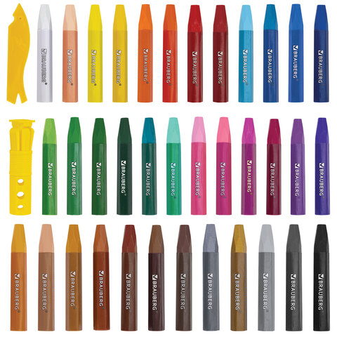 Палитра состоит из 36 ярких и насыщенных цветов, в комплекте стек, держатель и точилка для мелка. Полностью безопасны в использовании, не токсичны и не имеют резкого запаха. Благодаря своему составу мелки пишут мягко и ярко. Утолщенная шестигранная форма корпуса и диаметр 11 мм делают их еще более удобными для тренировки руки.