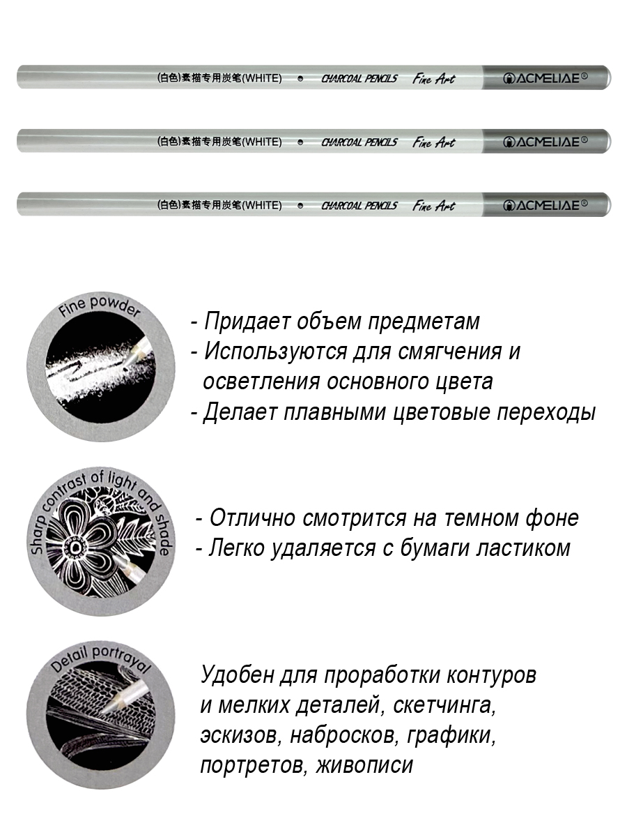 Набор высококачественных художественных угольных карандашей 3 штуки. Белый уголь для рисования сочетает лучшие характеристики угля и простых карандашей для творчества. Универсальный, обладают огромными возможностями в передаче света и тени. Удобен для проработки контуров и мелких деталей, скетчинга, эскизов, набросков, графики, портретов, живописи. Используются для смягчения и осветления основного цвета, создания монохромных рисунков, придания объема предметам за счет бликов, создания плавных цветовых переходов с помощью растушевки цвета. Помогает прорисовать светлые места, уменьшить насыщенность базовых цветов. Отлично смотрятся на темном фоне. Легко удаляется с бумаги ластиком. Подходят начинающим и профессиональным художникам, детям, школьникам, любителям рисования. Для студий и художественных школ. Корпус из натуральной древесины. Грифель - ударопрочный, с натуральным составом, мягко рисует по бумаге. Затачивается канцелярским ножом. Не пачкает руки. Корпус: круглый.