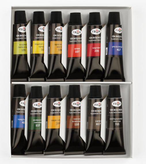 Набор профессиональной художественной акварели «ГАММА» серии «Старый мастер» состоит из 12 цветов. Объём одной тубы – 9 мл.