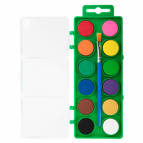 В наборе 12 насыщенных цветов, которые отлично смешиваются, позволяя создавать множество оттенков. Краски легко наносятся, образуя интенсивное яркое покрытие. Обеспечивают однородное окрашивание, быстро высыхают и не портятся со временем. Краски нетоксичны и безопасны для детей. Выпускаются в пластиковом пенале с европодвесом, прозрачной крышкой, круглой формой кювет и отделением для кисточки. Кисть входит в комплект! Съемную пластиковую крышку можно использовать в качестве палитры для смешивания красок. Пенал дополнительно упакован в термоусадку.