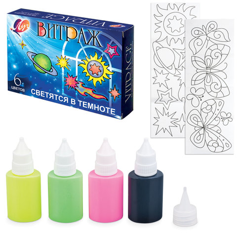 В наборе: контур витражный чёрный, 5 цветов витражной краски, светящейся в темноте ( розовый флуоресцентный, зелёный флуоресцентный, голубой неоновый с блёстками, розовый неоновый с блёстками), плёнка -файл, запасные носики для флаконов 2 шт., рисунки-шаблоны.