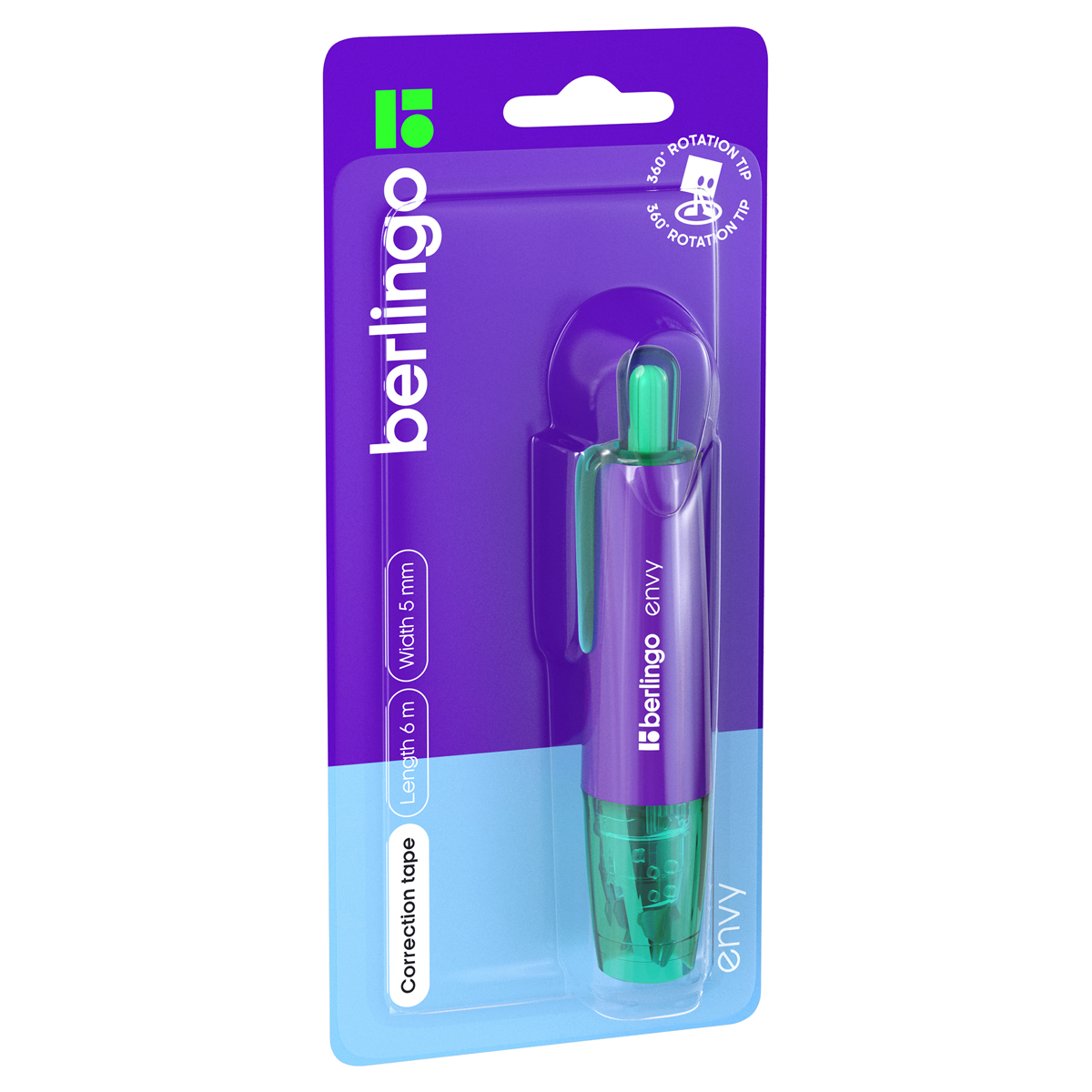 Корректирующая лента Berlingo Envy подходит для машинописного или рукописного текста. Лента длиной 6 метров и шириной 5 мм точно и плотно покрывает строку. В данной модели используется конструкция прямой подачи ленты, которая является более надежной, предотвращает сползание ленты с наконечника и ее перекручивание во время использования. Имеет подвижный наконечник, благодаря которому лента может использоваться под любым углом. Стабилизатор позволяет добиться ровной линии. Автоматическая конструкция позволяет убирать наконечник, тем самым защищая его. Корпус выполнен в трех цветах ассорти. Упаковка – картонный дисплей бокс. Каждая лента покрыта защитной пленкой для безопасной транспортировки. Является частью одноименной кросс-серии продукции бренда Berlingo.