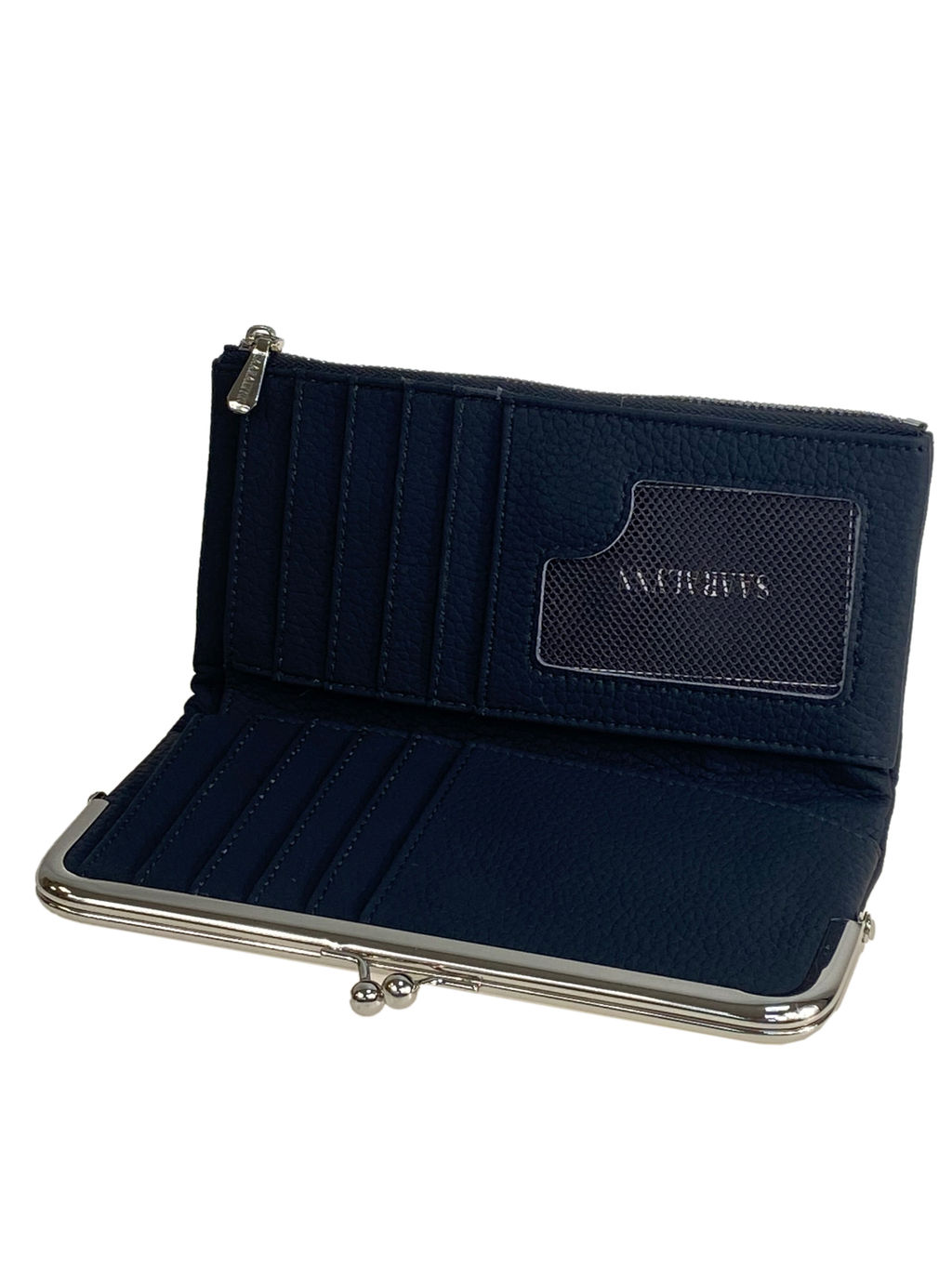 Компактный женский кошелёк из искусственной кожи. Кошелёк закрывается на скрытую магнитную кнопку. Внутри три отделения под купюры . На левом и правом развороте по 5 отсеков для пластиковых карт. Снаружи отделение на молнии и отделение с фермуаром.