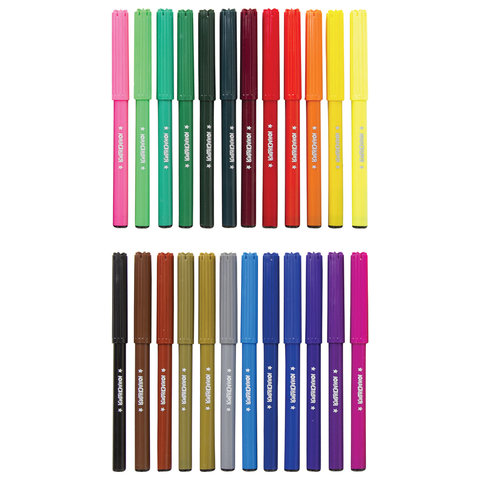 Обладают яркими насыщенными цветами в количестве 24 штук. Удобная круглая форма корпуса, длина которого 139 мм, а диаметр - 8,5 мм. Благодаря толщине линии письма 1 мм и диаметру пишущего узла 2,1 мм процесс раскрашивания становится легким. Длина письма составляет 600 м: такого расхода хватит надолго. Фломастеры изготовлены на водной основе, поэтому они безопасны и легко смываются с большинства материалов и кожи. Наконечник, устойчивый к продавливанию, не проваливается внутрь корпуса и не деформируется даже при сильном нажатии. Полипропиленовый корпус значительно продлевает срок службы фломастеров. Колпачок имеет специальные прорези для вентиляции, которые способствуют прохождению воздуха при попадании в дыхательные пути малыша. Рекомендованы для детей от 3-х лет.