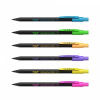 Механический мини карандаш шестигранной формы. Корпус в черном цвете с шестью яркими неоновыми деталями. Оснащен ластиком и удобным клипом.