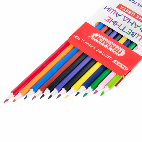 Набор состоит из 12 самых популярных цветов: красный, оранжевый, желтый, зеленый, салатовый, голубой, синий, розовый, фиолетовый, коричневый, темно-коричневый, черный. Шестигранная форма сечения корпуса позволяет карандашу не скатываться с поверхности стола во время занятий рисованием. Карандаши изготовлены из нетоксичного переработанного пластика. Корпус при разломе не образует острые края и безопасен для детей. Грифель легко затачивается и обладает повышенной прочностью. Все карандаши заточены и поставляются в картонной упаковке с европодвесом.