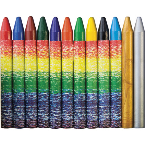 Мелки очень мягкие. Ребенку не нужно сильно нажимать, чтобы появилась линия. Легко скользят по поверхности, оставляя яркие линии и штрихи, цвета насыщенные. В наборе 12 цветов: 10 цветов и два мелка золотого и серебряного цвета. Каждый мелок завернут в бумажную этикетку. Это снижает скольжение, улучшает прочность мелка, предохраняет от загрязнений всего вокруг. Изготовлены на основе воска с добавлением масла, вследствие чего рисуют мягко, хорошо укрывая поверхность.