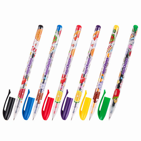 Ручка имеет круглый яркий с печатью корпус. Сменный стержень длиной 130 мм со стандартным наконечником позволит использовать ручку максимально долго. Диаметр пишущего узла, равный 0,5 мм, создает линию письма, равную 0,35 мм. Набор включает гелевые ручки из 6 различных ярких чернил: желтый, зеленый, черный, красный, синий, фиолетовый.