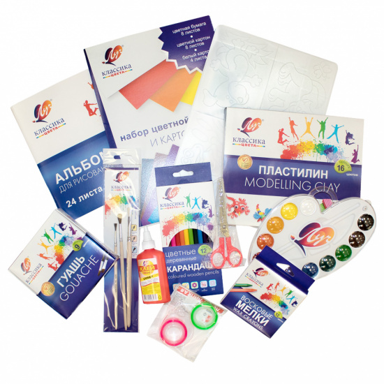 "Набор ""Классика цвета"" состоит из различных канцелярских товаров, которые упакованы в красочный картонный чемодан с пластиковой ручкой. Габаритные размеры: 343*267*60. В наборе скомплектованны самые необходимые материалы для творчества, которые включены в обязательный список покупок к школе."
