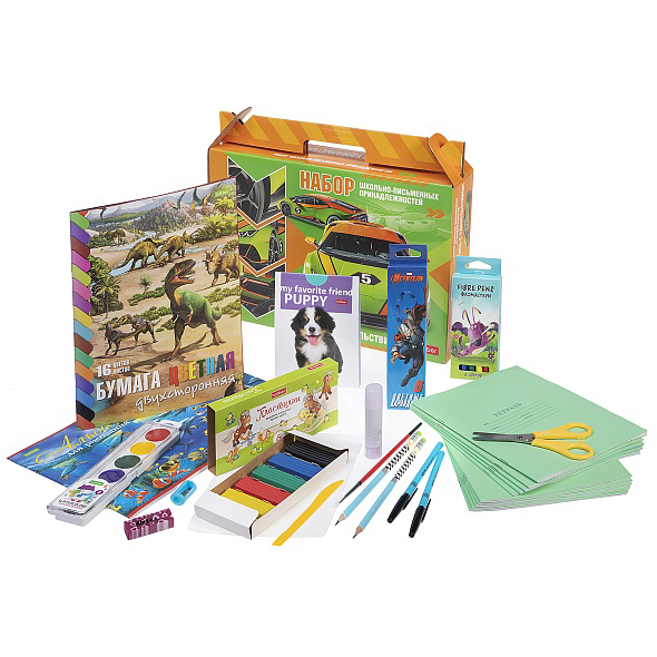 Набор школьно-письменных и канцелярских принадлежностей включает в себя предметы первой необходимости первоклассника и соответствует заявленным требованиям на начальном этапе школьной программы. К набору прилагается список, информирующий о его содержимом. Набор подходит для выпускников детских садов и первоклассников. Упаковка: красочно оформленная подарочная коробка-портфель из плотного картона в стрейч-пленке.