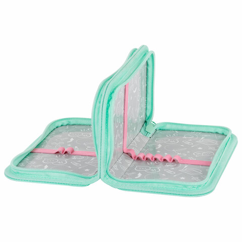 Пенал имеет 2 отделения, внутри каждой створки – прочные резинки для канцелярских принадлежностей. Внутренняя часть выполнена из картона с глянцевой ламинацией и узором.