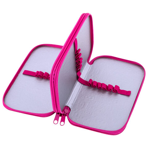 Внутри пенала – прочные резинки для канцелярских принадлежностей, внутренняя часть выполнена из картона с глянцевой ламинацией с узором.