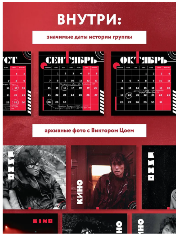 Эксклюзивный лицензионный настенный календарь на 2026 год, посвящённый группе "Кино". Внутри — редкие архивные кадры Виктора Цоя и важные даты, связанные с легендарным коллективом: дни рождения участников, даты выхода альбомов, ключевые концерты и день, когда в СССР было запрещено распространение музыки рок-группы. Идеальный подарок для поклонников "Кино" и ценителей советской эстетики.