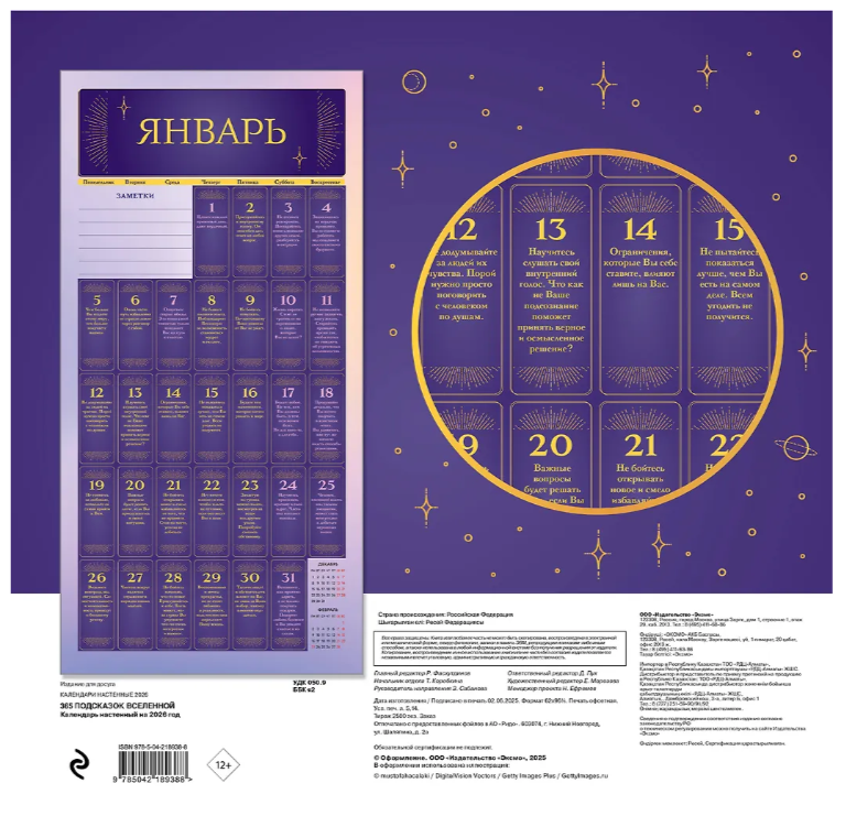 В хаотичном мире часто приходится отвлекаться на бесконечный поток дел и мыслей, и это отдаляет нас от истинных желаний и потребностей. Календарь с Подсказками Вселенной призван успокоить ум и пробудить ваши истинные желания! Каждый новый день вас будет ждать вдохновляющая подсказка, мягкий совет или напоминание о чем-то важном. Удобный формат 300х300 мм позволит повесить календарь абсолютно везде и любоваться им круглый год. Доверьтесь Вселенной — она знает, что вам нужно!